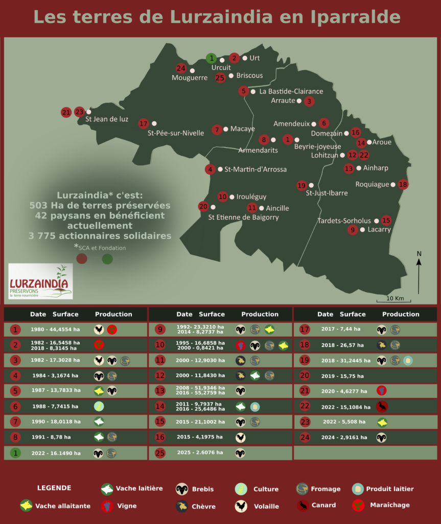 De plus, sur les terres déjà acquises par le GFAM Lurra, suite au départ à la retraite des fermiers en place, Lurzaindia a pu proposer du foncier à 13 autres paysans permettant ainsi leur installation ou consolidation.